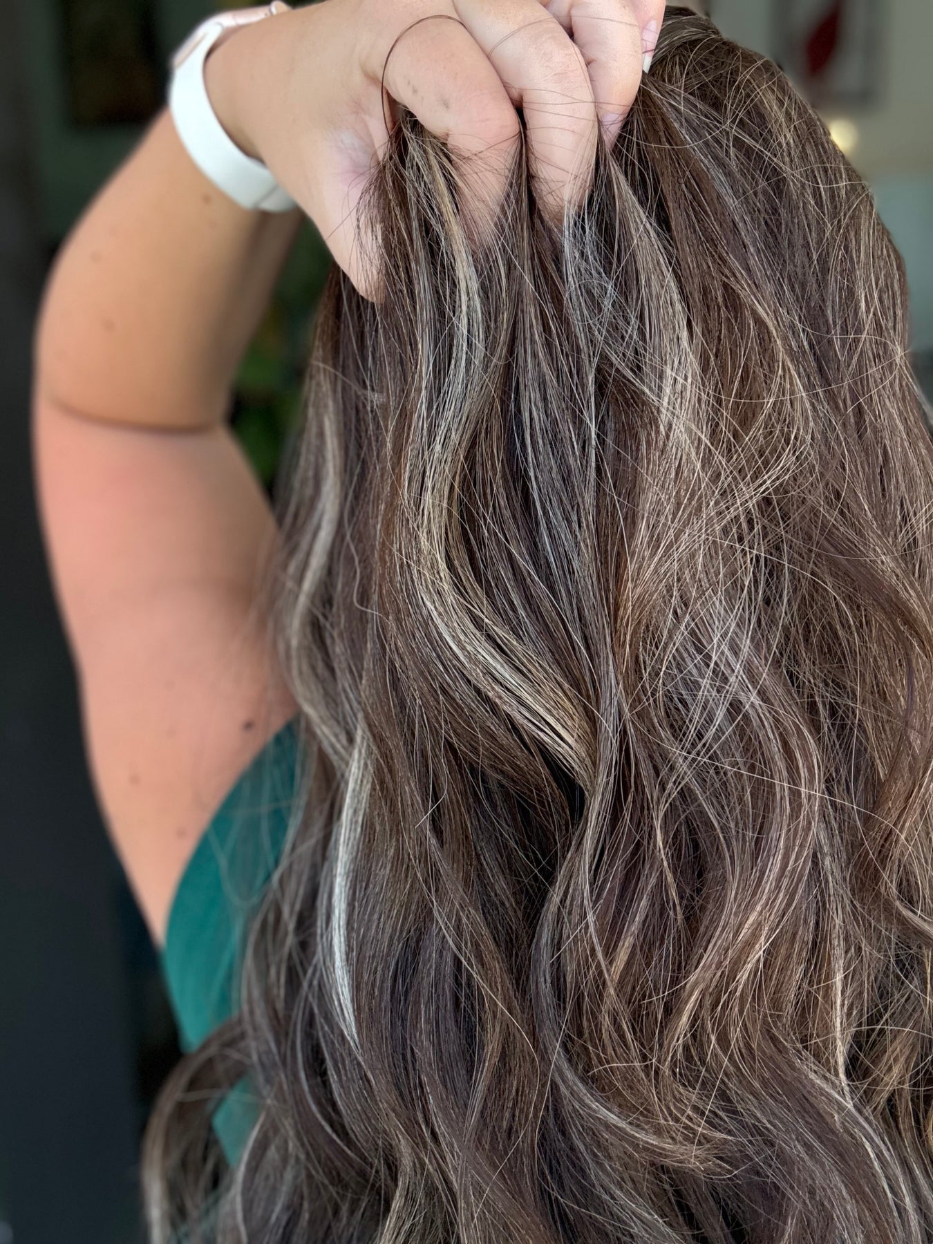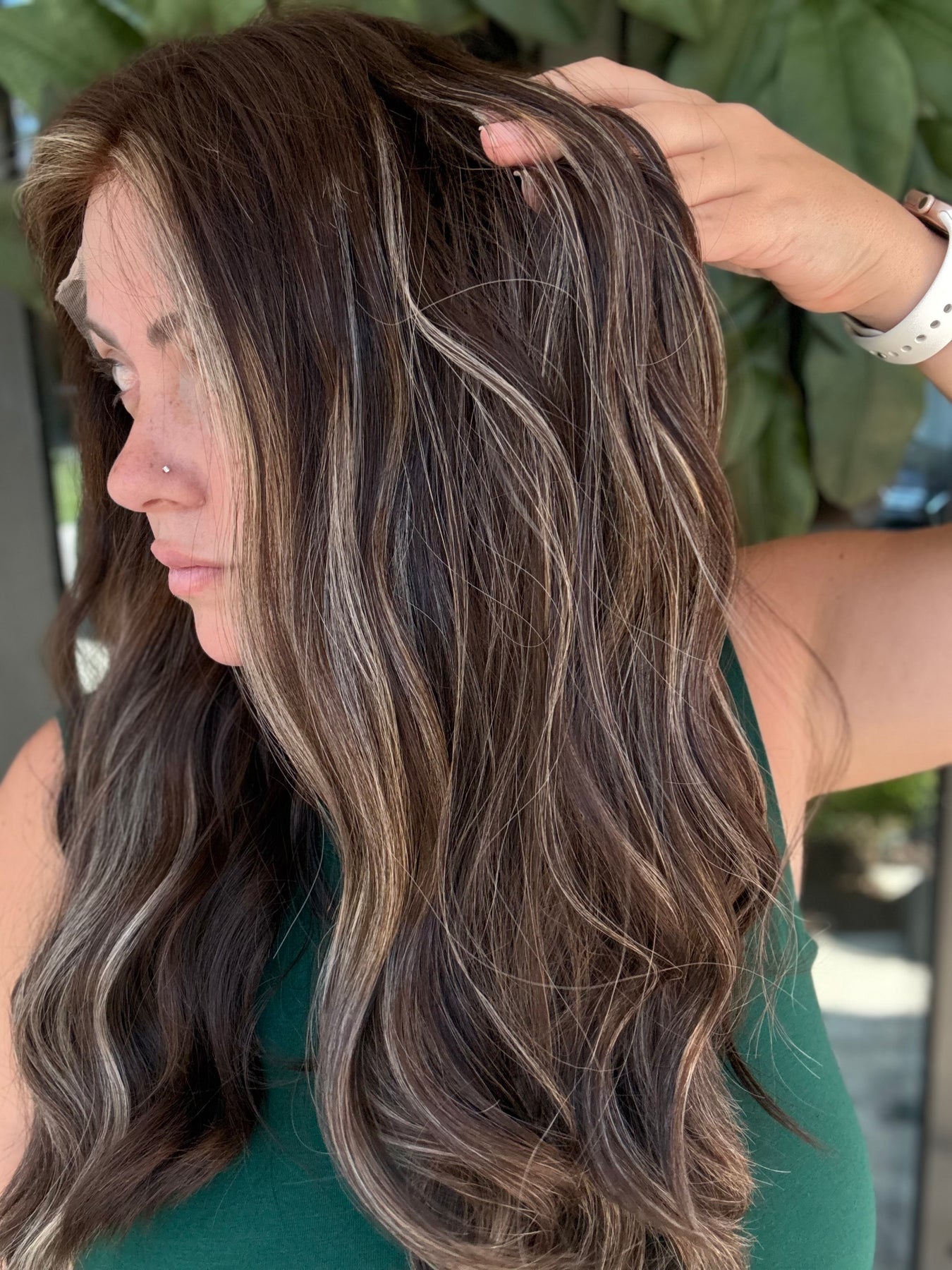 - Color: warm medium brown base with subtle balayage and blonde money pieces